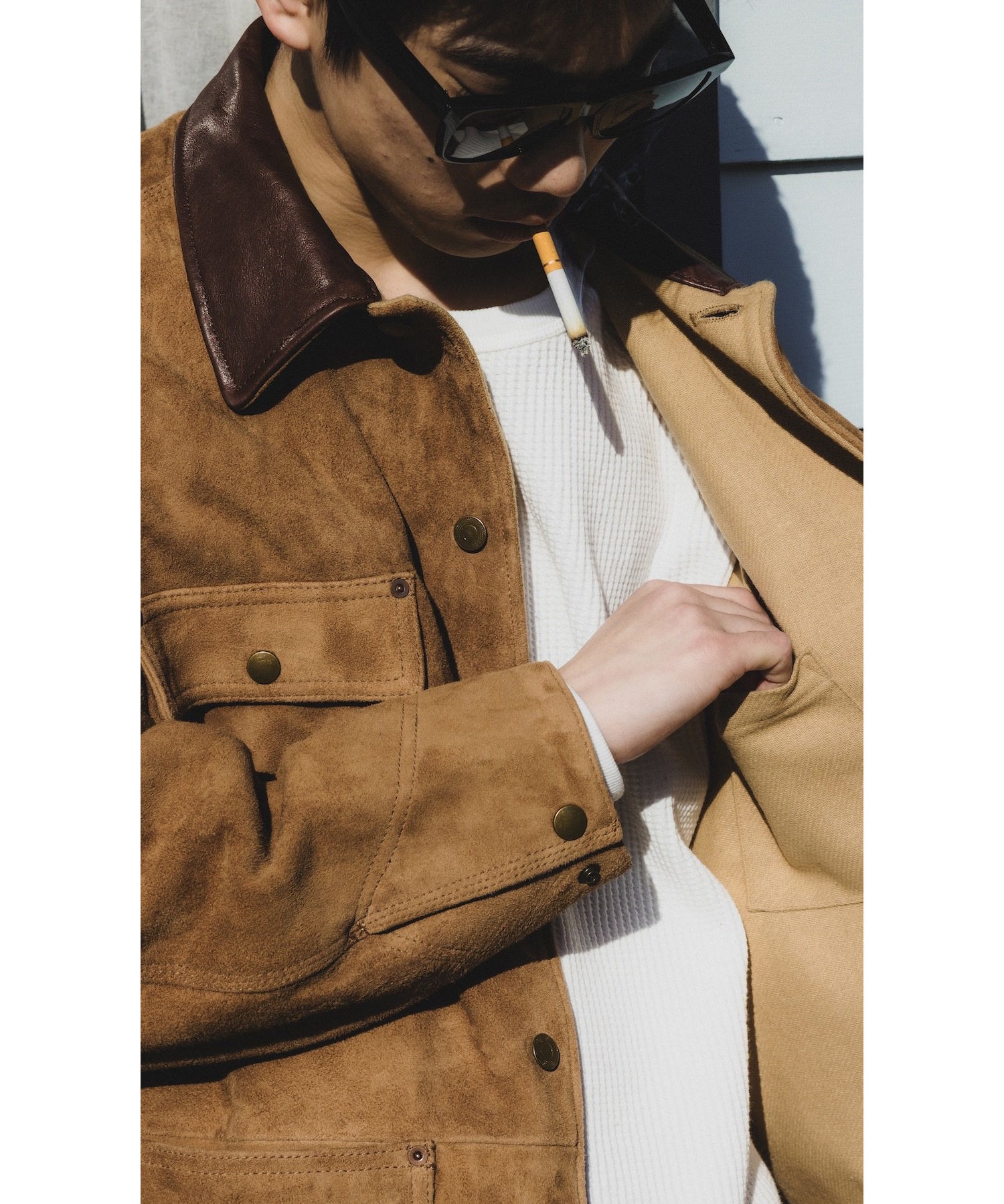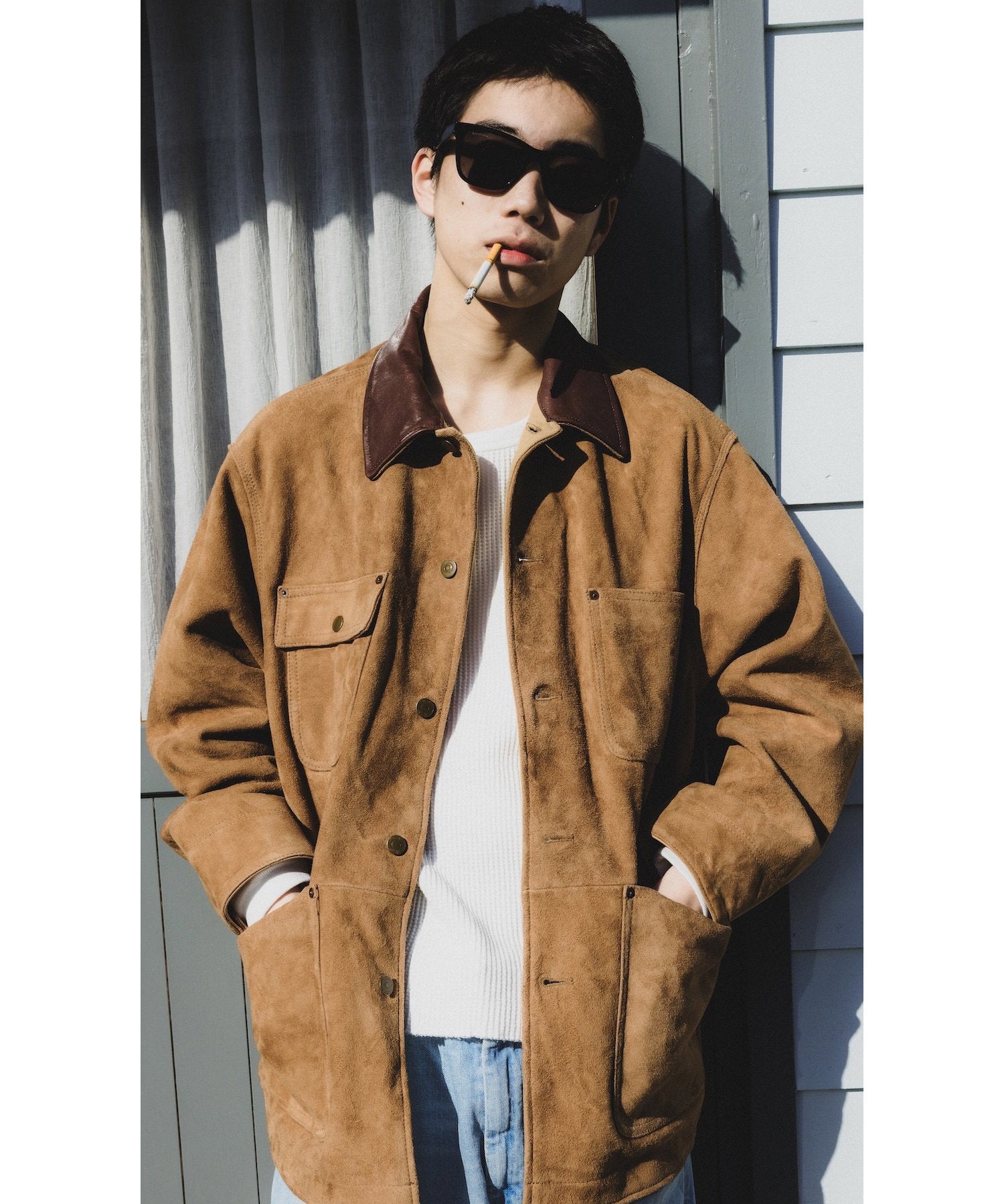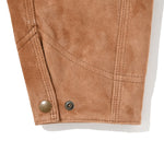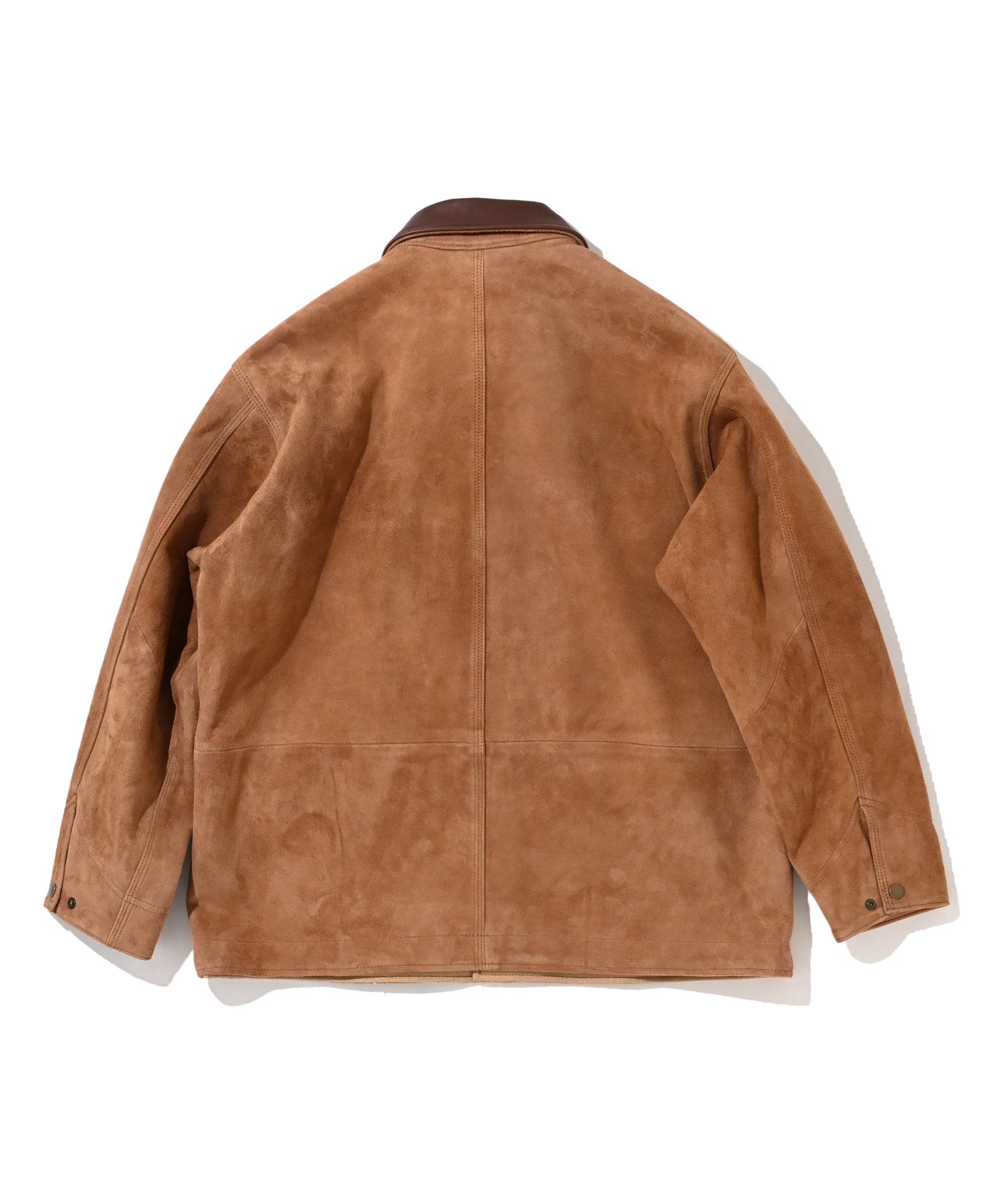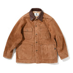 カワーオール。チョアコート型カバーオール。今回も運転時に脱がずに着れる革ジャンをコンセプトに軽さと柔らかさにとことん拘ったゴートの銀面付きスエードを使用。適度な厚みの銀面層により堅牢性を保ちつつ、表面は自然な粗さのある毛羽感に仕上げ、着用とともにしなやかなエイジングが生まれるバランスに調整しました。