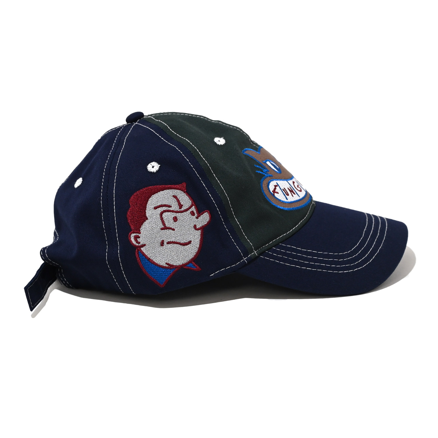 サイドとフロントにアイコニックな刺繍が施された6panelのキャップ。生地は100%コットンでアジャスタブル。パネルの切り替えやステッチワークが効いています。